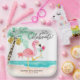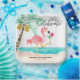 Des assiettes en papier pour fêtes d'anniversaire amusantes et festives présentent un flamant rose sur la plage et un cocktail tropical à côté d'un palmier avec une légende "fêtons" dans un script d'écriture moderne et décontractée. Parfait pour les fêtes de piscine, les barques de mer et la plage à thème, les fêtes d'été.