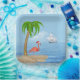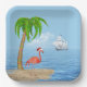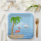 Flamingo rose avec casquette Père Noël et palmier de Noël dans le sable de plage avec bateau et eau de mer.