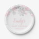 Plaque en papier baby shower moderne ornée de motifs de flocons de neige en parties scintillant d'hiver rose et argent.