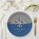 Personnalisez votre événement fiançailles, mariage ou anniversaire à la Nouvelle-Orléans avec ces plaques en papier représentant un symbole Fleur de lis en argent de style métal dans un design bleu et gris profond.