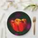 Fleur de tulipe rouge éclatante contre les taches arrière - plans vert foncé et les taches floues roses d'autres fleurs de tulipe. Boule de feu, gobelet de lumière du soleil. Le symbole de la nouvelle vie. Brille, éclaire, irradie et inspire !