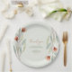 Assiette en papier personnalisable pour mariage avec fleurs rouges aquarelle, feuilles vert sauge sur fond vert pâle, et espace pour texte personnalisé.