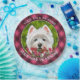 West Highland White Terrier et fleurs roses. Westie chien regardant au-dessus d'un buisson fleuri. Sophie. Copyright © 2025 Angi Laframboise. Tous droits réservés. Le chien d'art brasse des cadeaux pour les amoureux de les chiens.