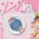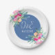 Assiettes en papier mariage personnalisées avec les initiales du couple avec de jolis accents floraux roses et un centre bleu avec police blanche. Thème de mariage floral élégant.