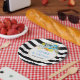 Plaque de papier mariage floral moderne et chic avec motif rayé noir et blanc, cercle blanc au centre avec votre texte et jolies fleurs folkloriques bleu et jaune aqua. C'est un choix parfait pour votre mariage douche nuptiale ou table de fête.