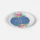 Assiettes en papier mariage personnalisées avec les initiales du couple avec des accents floraux roses et un centre bleu avec une police blanche. Thème de mariage floral élégant.