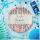 assiettes en papier mariage avec une belle motif avec de jolies fleurs roses posées sur le dessus une motif rayée composée de rayures bleues et crème. Un cadre rectangle avec une fausse bordure en feuille d'or superposée avec votre texte personnalisé à l'intérieur.