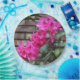 Jolies fleurs d'Azalea roses et feuilles verts près de cheminée en brique rouge. Photographie originale de TamiraZDesigns.