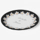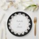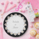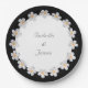 Fleurs de Plumeria blanches sur Assiettes de fête de mariage noir et blanc. Le texte peut être personnalisé pour l'anniversaire de mariage, l'anniversaire et plus encore..