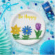 Arrière - plan blanc croustillant au tournesol jaune, marguerite bleu jaune, tulipe violette en fleurs dans l'herbe verte. Be Happy est écrit en typographie jaune. Belle pour les mois de printemps ou d'été ou à n'importe quel moment de l'année pour apporter l'extérieur à l'intérieur. Oeuvre originale de TamiraZDesigns.