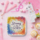 Le design comporte l'expression "Fort dans le Seigneur", élégamment rendu en lettres fluides et cursives. Autour du texte, des fleurs sauvages et des plantes délicats se mêlent, symbolisant la beauté et l'abondance de la grâce de Dieu. Les couleurs vives des rouges, des oranges et des jaunes sont appliquées avec des aquarelles, créant une atmosphère chaleureuse et accueillante qui incarne l'espoir et la foi. T