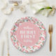 Un Berry mignon et ceinturon premier anniversaire design plaque de papier avec un motif de fraise rose aquarelle avec des feuilles verts autour du bord. Le centre de l'assiette a un cercle rose doux avec le nom de l'enfant BERRY PREMIER anniversaire en blanc, ajoutant une touche sucrée et personnalisée. Ce design est parfait pour une fête de Berry First, apportant un regard amusant et festif à votre table de fête. Idéal pour le printemps, l'été ou toute saison pour fêter votre petit avec un thème charmant et ludique.