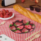 Les fraises et les tranches sont peintes avec des aquarelles et le motif est fait en Illustrator.