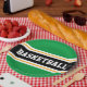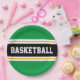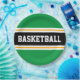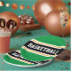 Cette conception sportive présente du texte en BASKETBALL en gras à l'intérieur d'une large bande horizontale de course centrale en noir surligné avec des rayures blanches flottantes jumelles contre des rayures extérieures verdoyantes. Le texte peut être personnalisé.