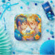 Assiettes en papier personnalisées pour mariage réception ou dîner de répétition. Garçon et fille anime se câlinant entourés de fleurs jaunes. Beaucoup de détails bleus.