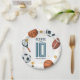 Ce modèle de plaque en papier anniversaire de enfant, mignon et moderne, sur le thème du sport, présente un dessin animé sportif, avec un ballon de basket, de football, de football, de raquette de tennis, un trophée et des étoiles. L'assiette peut être personnalisée avec le nom, l'âge et la date de la fête de votre garçon. L'addition sportive parfaite à la fête de votre enfant.