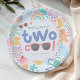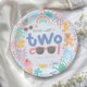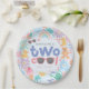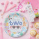 Cute and girly Two Cool birthday paper plate for a girl’s summer splash or toddler pool party. Featuring pastel pink whimsical water-themed illustrations including a rubber duck, wellies, rainbow, bubbles, watering can, and flowers. Perfect for kids’ birthday tableware, party decor, and cute coordinated splash party celebrations.