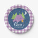 Glamping fille Camping assiettes d'anniversaire avec tente violette, arbres et arrière - plan rose plaid.