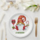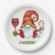 Ces assiettes de papier amusantes sont ornées d'une image d'un elfe de gnome habillé d'un chapeau de Père Noël motif de rennes rouge et or. Il tient un verre de vin du Père Noël d'une main, et un sucre de canne rayé rouge et blanc de l'autre. En bas se trouve un champ de texte personnalisé, qui est montré en disant Cheers! en vert assorti. Amusez-vous pour n'importe quelle fête de vacances !