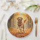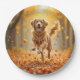 Un joyeux chien de repérage d'or court à travers une forêt d'automne entourée de feuilles en chute colorée