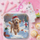 Un Goldendoodle moelleux court à travers la scène hivernale enneigée, portant un casquette de Noël rouge festif. Ce design animé met en valeur le manteau bouclé de la race, la nature affectueuse et la personnalité joyeuse tout en capturant l'esprit joyeux de la saison des fêtes. Un moment d'hiver plein de charme festif.