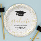 Ces élégantes plaques de papier noir, blanc et or de la fête de graduation ont le mot "gradué" dans la police de script de calligraphie moderne, avec le nom du diplômé et la classe de l'année, et un grand casquette au sommet. Il y a un cadre de confettis de parties scintillant en faux or autour du bord.
