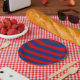 Un arrière - plan moderne rouge et bleu rayures horizontales vives imprimer pour un cadeau personnalisé.