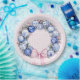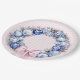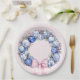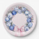 Cette assiette de fête de Noël est ornée d'une couronne de Noël en chinoiserie bleue et blanche avec un arc rose.