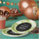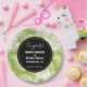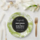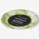 Plaques de papier mariage personnalisées avec un motif extensible de grands feuilles de palme sur un arrière - plan vert olive. Un cercle noir avec une bordure dorée superposée avec vos détails personnalisés à l'intérieur.