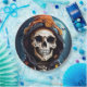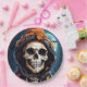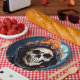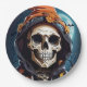Plaques en papier avec illustration d'un squelette portant une veste à capuchon avec un casquette de sorcière orange sur le dessus. Entouré de citrouilles mignons et éffrayants. Une lune brillante dans le dos avec une seule chauve-souris volant à proximité. Fun automne design Halloween.