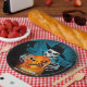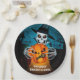 Un squelette éffrayant dans un casquette de houblon tient une lanterne de valet effrayant sur une nuit d'Halloween sombre sur ces plaques de papier de fête d'Halloween. CORRESPONDRE des articles dans notre magasin.
