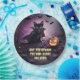 Un chaton noir avec sac de vampire, dents et chauves-souris tout autour. Une plaque de papier à thème Halloween amusante.