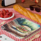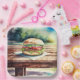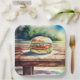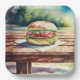 Hamburger sur une table de pique-nique pour que les gens puissent mettre un hamburger sur une table de pique-nique. Donc méta.