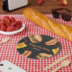 L'illustration de Destei de certains aliments rapides, dont des boissons orange avec pailles rouges, des hot dogs avec ketchup et moutarde sur le dessus et des hamburgers remplis de fromage, laitue, boeuf, tomate, ketchup et cornichons. La couleur arrière - plan est gris foncé, presque noir. Il y a aussi deux zones de texte personnalisables.