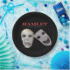 Pour des cuirs épais de théâtre. Le titre d'expositions de Hamlet de Shakespeare en rouge lumineux et sont dessous des masques de comédie. Derrière un masque grimacent des dents et un oeil bleu simple.