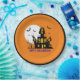 Whimsical Happy Halloween maison hantée avec fenêtre jaune brillant avec une pleine lune, chauves-souris, chats, chauves-souris vampires et de grands yeux.