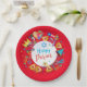 Happy Purim - Paper Plate. Translation from Hebrew: Happy Purim! Purim Jewish Holiday poster with stars of David, traditional Hamantaschen cookies, gragger toy - noisemaker, balloons, musicians, masks, Purim basket on festive confetti background. Wish a great Purim celebration. Carnival, Masquerade, Festival, Kids Party, Israel. Crafts & Party Supplies > Party Supplies > Tableware > Paper & Party Plates