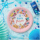 Happy Purim - Paper Plate. Translation from Hebrew: Happy Purim! Purim Jewish Holiday poster with stars of David, traditional Hamantaschen cookies, gragger toy - noisemaker, balloons, musicians, masks, Purim basket on festive confetti background. Wish a great Purim celebration. Carnival, Masquerade, Festival, Kids Party, Israel. Crafts & Party Supplies > Party Supplies > Tableware > Paper & Party Plates