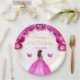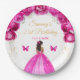 Cette assiette de fête d'anniversaire élégante et glamour présente une belle princesse à la peau foncée dans une robe de bal rose chaud. Le texte combine écriture manuscrite et polices sans serif modernes pour un look élégant et sophistiqué. Les arrangements floraux, papillons et confettis d'or créent un mélange parfait de rustique et de chic. Graphiques par www.etsy.com/uk/shop/SunflowerDayLove