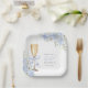 Élégantes assiettes en papier pour shower de mariage floral, avec un arrangement floral d'hortensia bleu pastel délicat et une typographie élégante.