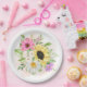 Cette assiette en papier est présentée en blanc avec une jolie impression florale.