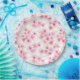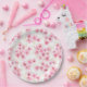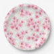 Cette assiette en papier est présentée dans une charmante impression de fleurs roses.