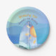 Cette assiette de fête, mignonne et anniversaire de enfant, présente une ambiance de surf de plage aux bleus côtiers et peut être personnalisée avec le nom de votre enfant pour sa journée spéciale.