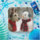 A charming scene captures an Irish Wolfhound dog wearing reindeer antlers and a red scarf beside a snowman adorned with earmuffs and a plaid scarf, all set against a backdrop of falling snowflakes in a wintry forest