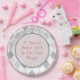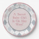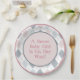 De superbes plaques en papier à motif Jacquard rose, gris et blanc coordonnent avec la Suite Baby shower Leaping Baby Lambs. Texte : "Une petite fille douce est en route" au centre.