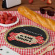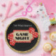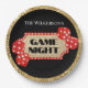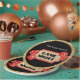 Ces assiettes de fête personnalisées sont décorées d'un thème de nuit de jeu glamour sur un arrière - plan noir. Un panneau de parties scintillant est placé au centre, avec un arrière - plan de parties scintillant dorée et une bordure rouge avec des lumières. Parties scintillant rouge jouant des dés sont placés de chaque côté du panneau Un cadre de bordure de paillettes d'or encadre la plaque.