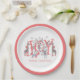 Typographie de JOIE illustrée unique en fantaisie Plaques de papier de Noël de fête d'hiver. Dégustez un peu de gaieté avec ce style festif d'assiette de fête. Un collage unique et fantaisiste d'animaux peints de bois et de safari. Rouge, bleu et gris sur blanc. Un type mignon et un spray de boughs. Faites de ce séjour un CHEERFUL !
