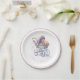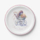Plaques en papier baby shower mignonnes, avec des graphiques d'un joli bébé buggy avec des fleurs et des arcs et une jante rose, autour du bord. Personnalisez le texte personnalisé rose selon vos besoins.