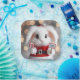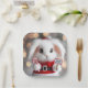 L'image représente une scène festive avec un lapin blanc comme protagoniste principal, habillé adorablement d'un costume Père Noël rouge. Le lapin tient un sucre de canne dans une patte et une pancarte qui dit "vacances pleines d'espoir" dans l'autre. La toile de fond est floue et présente des lumières chaudes et lumineuses qui donnent une ambiance de fête et de joie de fêtes.
