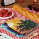 Plaques d'anniversaire. couleurs vintages silhouette de palmier et vagues de l'océan sur une plage de sable ai généré des oeuvres d'art.